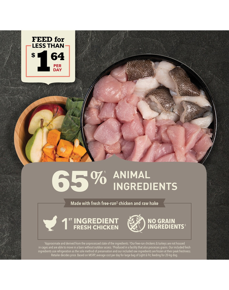 Świeże mięso kurczaka (20,5%), dehydratyzowany kurczak (20%), cała czerwona soczewica, cały groch zielony, włókno grochu, świeże organy kurczaka (wątroba, serce) (5%), dehydratyzowany indyk (5%), dehydratyzowany śledź (4%), jaja (4%), surowa fladra (4%), cała ciecierzyca, cała zielona soczewica, cały groch żółty, skrobia grochowa, tłuszcz z kurczaka (1%), olej rybny (1%), surowa wątroba indyka (0,5%), sól, suszony kelp, świeża cała dynia, świeża cała dynia piżmowa, świeża cała marchew, świeże całe jabłka, świeże całe gruszki, świeża cała cukinia, suszony korzeń cykorii, świeży jarmuż, świeży szpinak, świeże liście rzepy, świeże liście buraków, świeża cała żurawina, świeże całe borówki, świeże całe jagody saskatoon, kurkuma, ostropest plamisty, korzeń łopianu, lawenda, korzeń prawoślazu lekarskiego, owoce dzikiej róży.