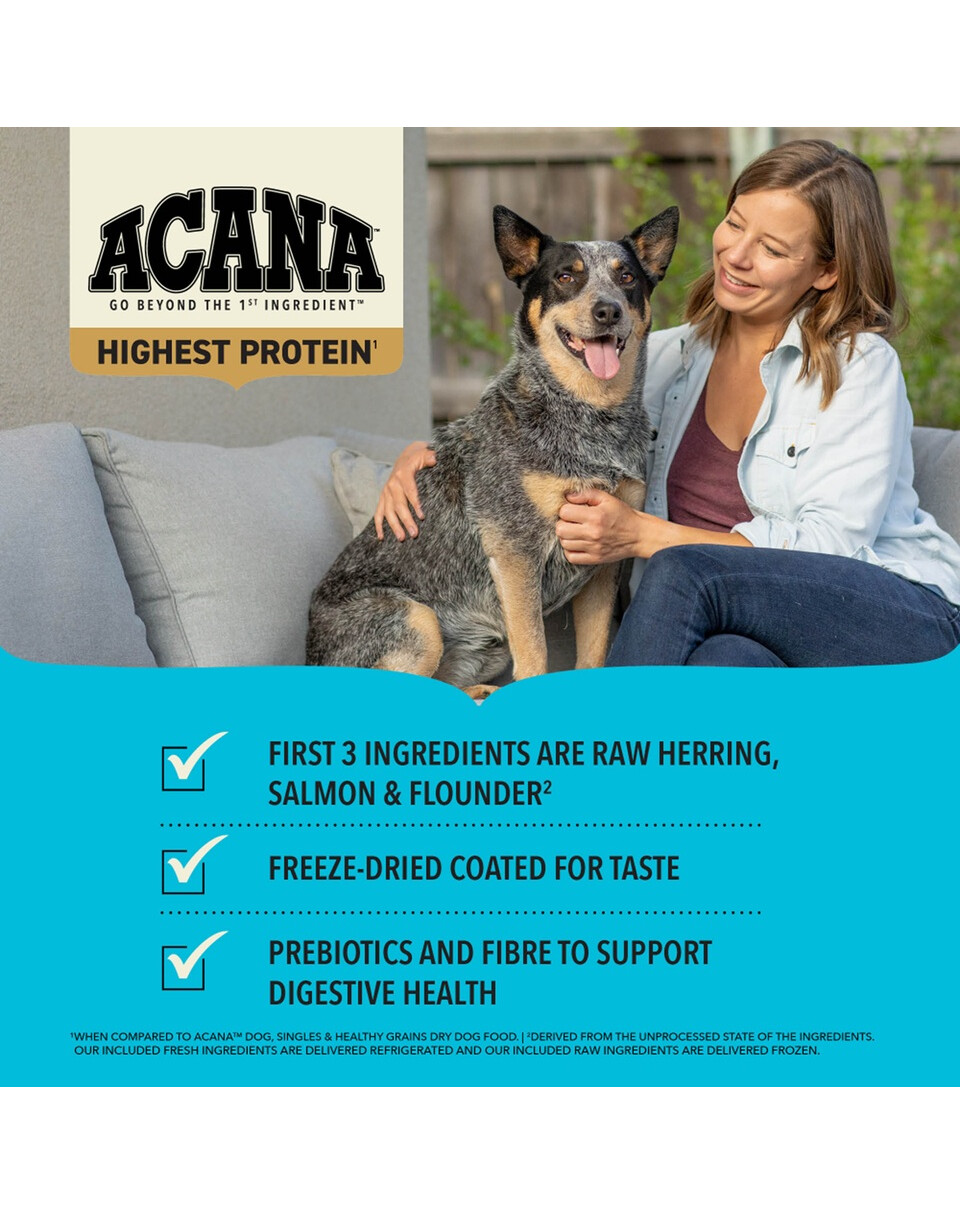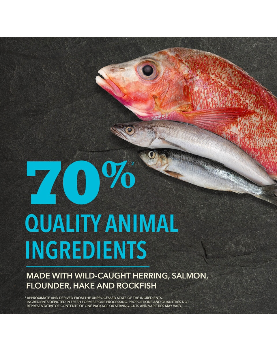 Receptura karmy składa się w 70% z ryb z naturalnych połowów w kanadyjskich wodach północnego Pacyfiku. Użyte zostały m.in. sardynki, śledzie, flądry, dorsze, białoryby, morszczuki, a także olej z łososia. To wszystko sprawia, że karma jest bogata w łatwo przyswajalne białko i obfituje w zdrowy tłuszcz oraz nienasycone kwasy tłuszczowe Omega-3 i -6. Niski poziom węglowodanów zapobiega skokom cukru we krwi, a więc minimalizuje ryzyko wystąpienia cukrzycy oraz nadmiernego apetytu u psów. Wysoki poziom wartościowego białka szybciej i na dłużej zapewnia uczucie sytości. Dodatkowo taki skład pozwala zachować dobrą kondycję organizmu, a także dba o mięśnie i kości zwierzęcia. Ryby stanowią świetne źródło zdrowych tłuszczy, białka i nienasyconych kwasów tłuszczowych, które wzmacniają serce, mózg, poprawiają kondycję skóry i sierści. Dodatek do karmy owoców, warzyw i ziół poprawia jej smakowitość i aromatyczność. Jabłka, gruszki, dynia dostarczają naturalnych witamin i przeciwutleniaczy wspierając tym samym układ odpornościowy.