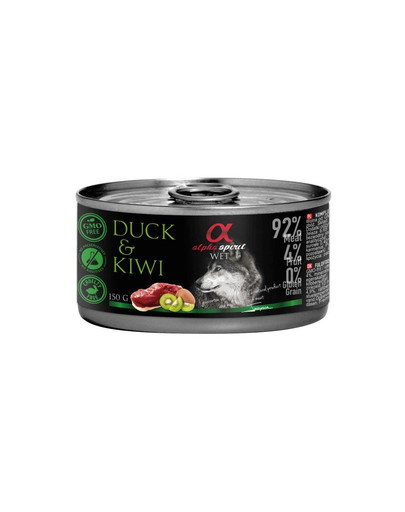 Zawiera wyjątkowe połączenie smaków - świeże mięso kaczki wraz z owocami kiwi i dodatkami. Bardzo wysoka zawartość mięsa - 92%, czyni tę karmę bardzo zdrową i atraktycjną dla psów. Mięso kaczki jest bardzo dobrze strawne i odżywcze dla mięsożerców. Pozwala to na zachowanie dobrej kondycji organizmu. Kiwi posiada dużo witaminy C, która wzmacnia układ immunologiczny.