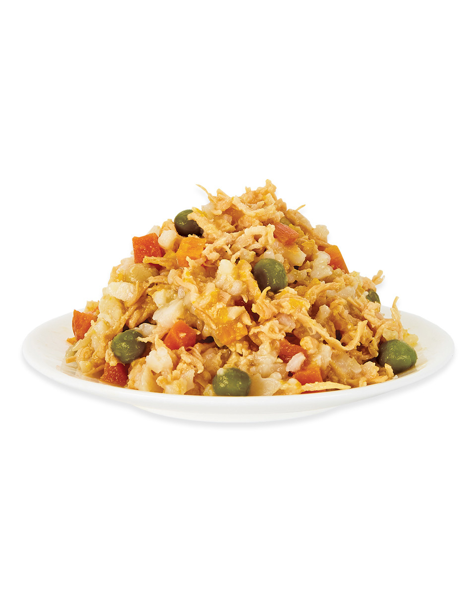 Piers z kurczaka (45%), bulion drobiowy, dynia (8%), marchew (8%), groszek (8%), ryz.