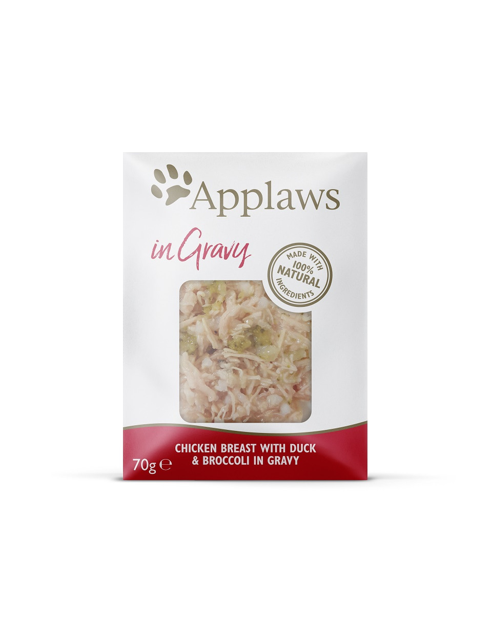 Pierś z kurczaka 60%, mięso kaczki 5%, brokuły 5%, ryż, galaretka warzywna, skrobia ziemniaczana