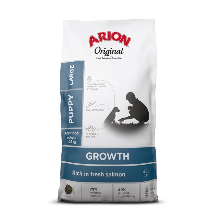 Arion Original Growth Salmon/Fish Puppy Large to kompletna karma dla dużych szczeniąt zawierająca świeżego łososia. Jego bezglutenowa, jednobiałkowa formuła na bazie ryb zawiera unikalne składniki morskie, probiotyki, prebiotyki, środki chroniące chrząstki oraz odpowiednią ilość witamin i minerałów.