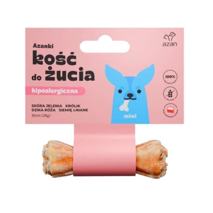 Wykonane ze skóry jelenia, skóry królika, dzikiej róży i siemienia lnianego, kości do żucia Azanki Mini są doskonałym przysmakiem dla dorosłych małych psów i psów małych ras, zaspokajającym ich naturalne potrzeby gryzienia i żucia. Kości nie zawierają ostrych ani łamliwych elementów, dzięki czemu stanowią bezpieczniejszą alternatywę dla różnych gryzaków.