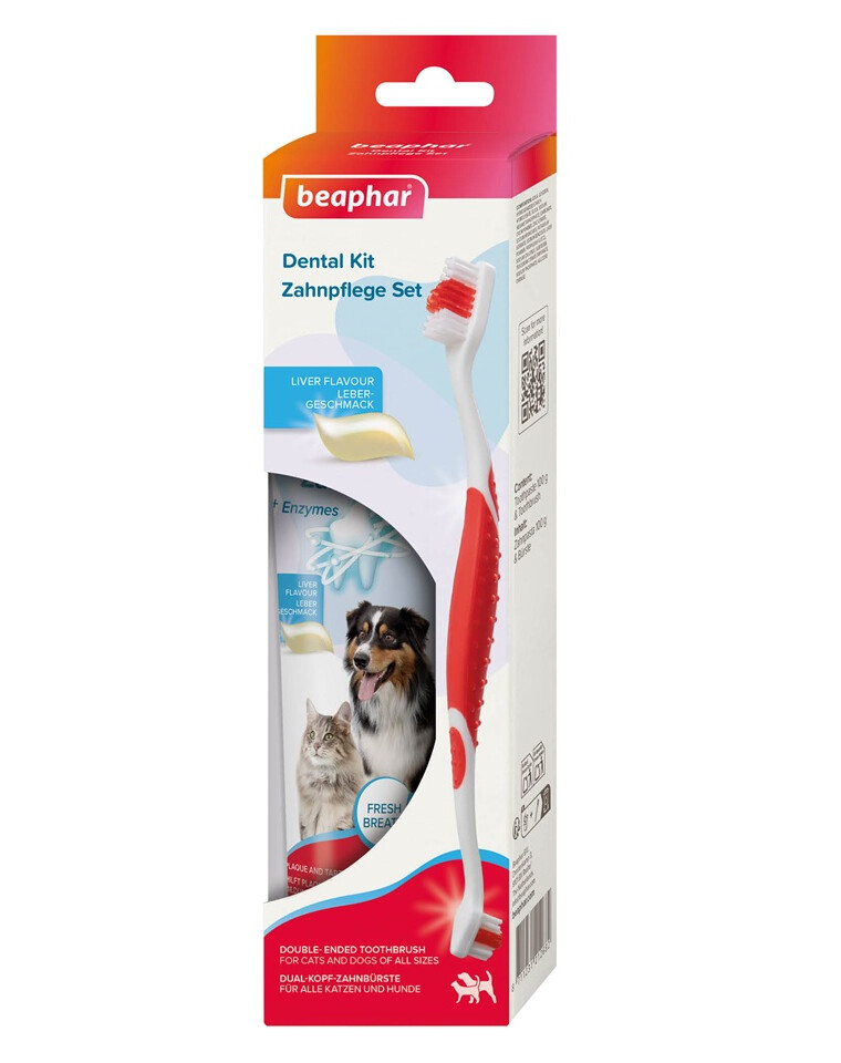 Zadbaj o czyste zęby i świeży oddech swojego pupila z kompletnym zestawem do higieny jamy ustnej dla psów i kotów, zawierającym szczoteczkę oraz pastę.