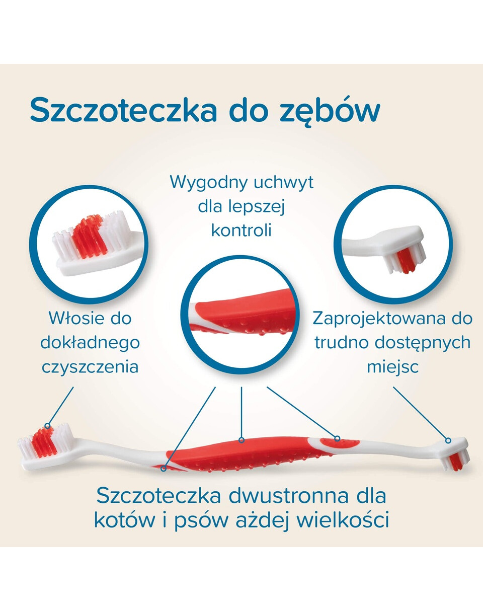 Szczoteczka ma miękki, ergonomiczny uchwyt, który pewnie leży w dłoni, oraz dwie końcówki o różnych rozmiarach, dostosowane do budowy jamy ustnej zarówno małych, jak i dużych zwierząt. Włosie o zróżnicowanej długości umożliwia dokładne czyszczenie nawet trudno dostępnych miejsc.