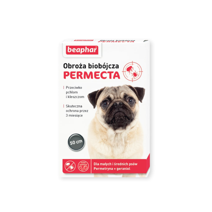 Beaphar Permecta to obroże biobójcze, które skutecznie zwalczają pchły i kleszcze. Obroża Permecta Dog w rozmiarze S i długości 50 cm, przeznaczona dla małych i