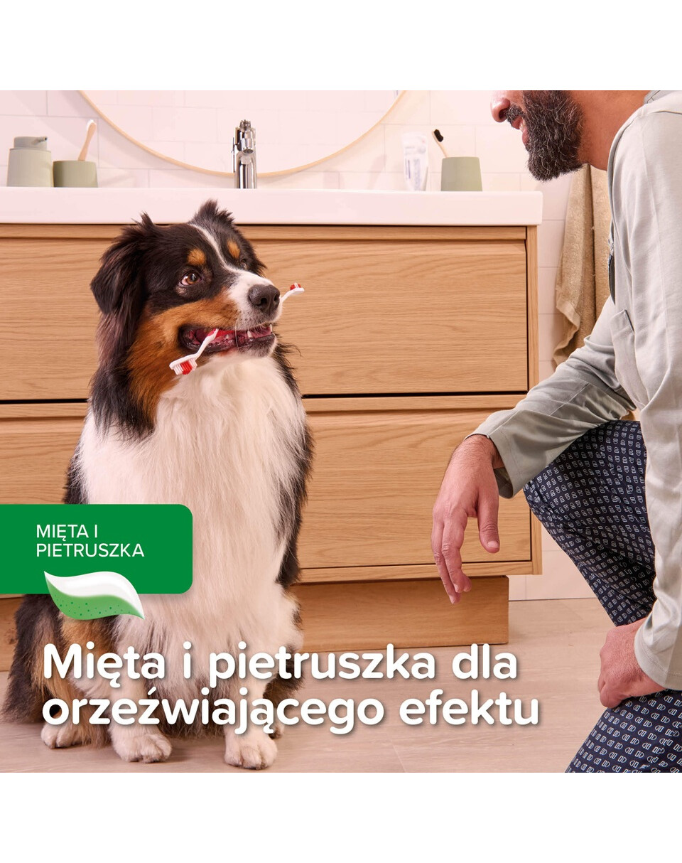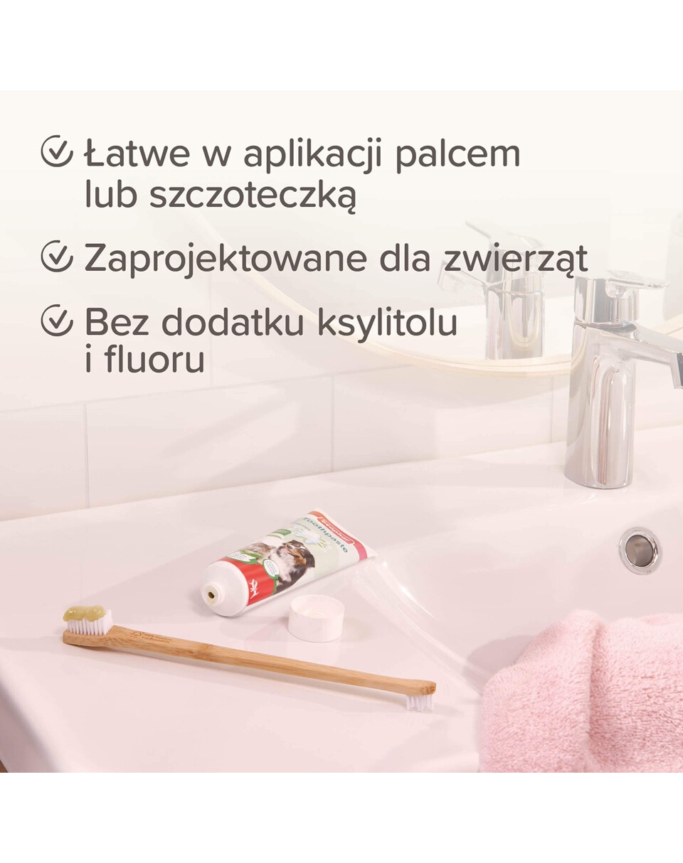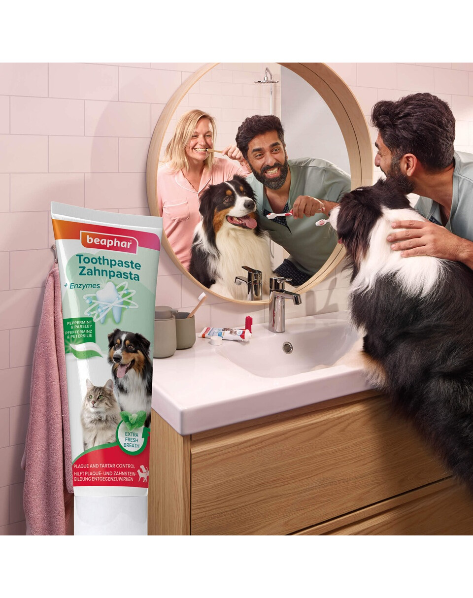 Specjalnie opracowana pasta do zębów o smaku miętowo-pietruszkowym od Beaphar, zawiera enzymy, które pomagają redukować płytkę nazębną i odświeżają oddech.