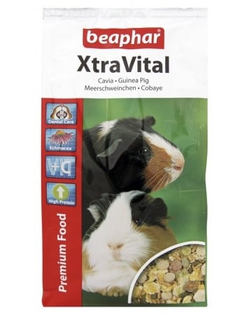 XtraVital Guinea Pig to smaczny i doskonale zbilansowany suchy pokarm, dopasowany d dony do żywieniowych wymagań świnek morskich. Kompozycja składu pożywienia dla świnek jest specyficzna, gdyżzz organizm świnek morskich nie wytwarza witaminy C. Niezbędne jest więc dostarczenie jej w karmie. XtraVital dla świnek morskich zachowuje optymalny bilans witaminy C znacznie dłużej niż w większości mieszanek, z uwagi na specyficzną kompozycję z innymi składnikami. Pokarm zawiera chelatowane minerały (otoczone białkiem dla poprawienia absorpcji). Dodatek twardych kawałków pomaga zadbać o prawidłowy stan uzębienia świnek. Pokarm zawiera wysokiej jakości białko pochodzenia roślinnego. Obniżona zawartość tłuszczu gwarantuje właściwą wagę, chroni przed otyłością. Specjalny rodzaj włókna zapewnia właściwą florę bakteryjną w jelitach.