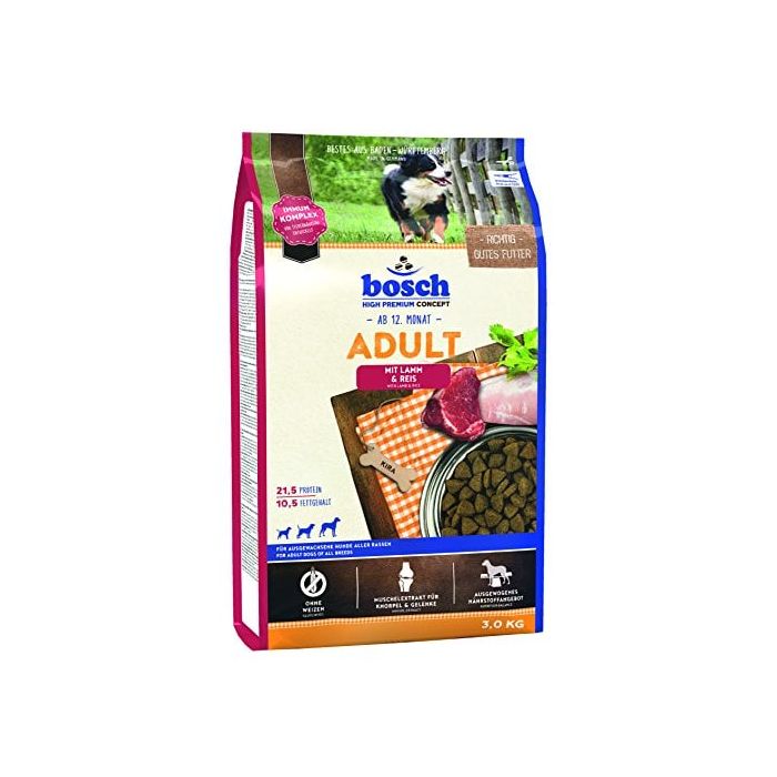 Bosch Adult to sucha karma dla dorosłego psa z mięsa jagnięcego i lekkostrawnego ryżu. Karma posiada wyważony stosunek substratów energetycznych i protein. Zawarty w jej recepturze ekstrakt z małży, zapobiega problemom związanym z nadwagą, obciażeniem kości i stawów. Dodatkowo karma ma w swej recepturze naturalną pszenicę orkiszową.
