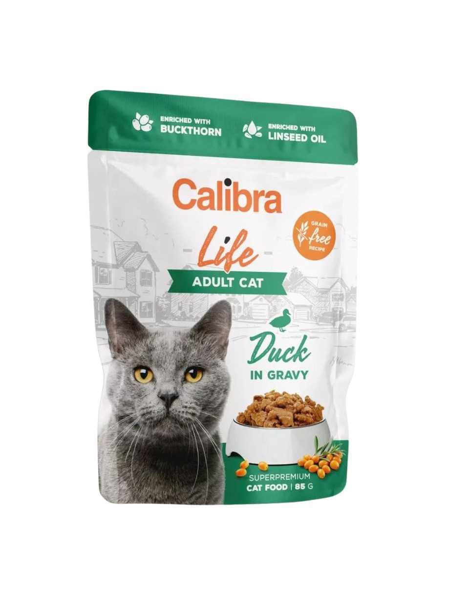 Calibra Cat Life pouch Adult Duck in gravy to mięsna saszetka dla dorosłych kotów, bez zbóż, z kaczką.