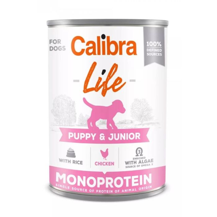 Calibra Dog Life Puppy & Junior Chicken with Rice - Kompletna mokra karma dla szczeniąt zawierająca kurczaka, serca kurczaka i ryż, odpowiednia również dla suk w ciąży i karmiących.