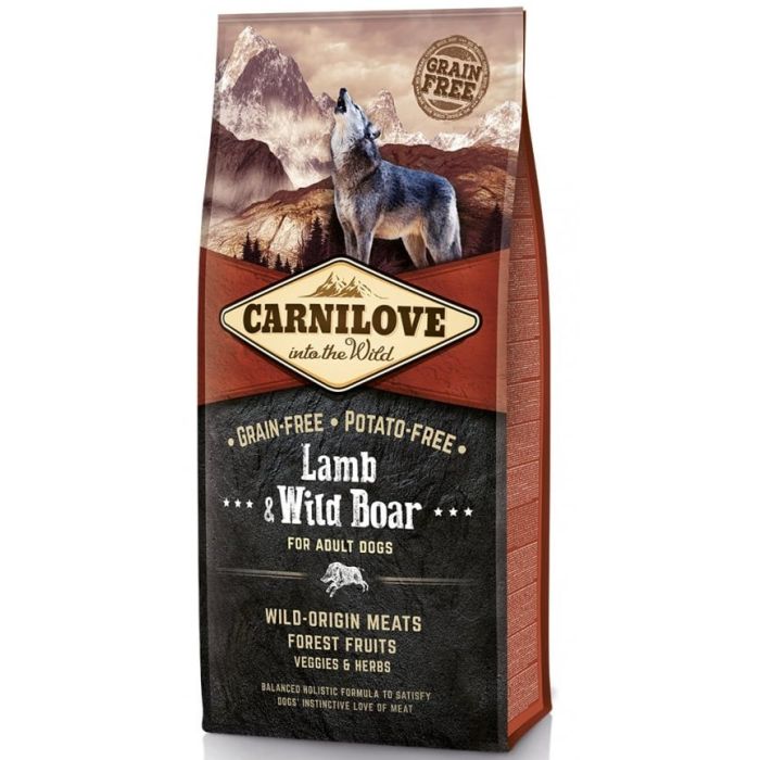 Mączka mięsna z dzika (30%), mączka z jagniąt chowanych na wolnym wybiegu (25%), żółty groszek (20%), tłuszcz z kurczaka (konserwowany mieszaniną tokoferoli, 10%), wątróbka z kurczaka (3%), jabłko (3%), skrobia tapioka (3%), olej z łososia (2%), marchew (1%), nasiona lnu (1%), ciecierzyca (1%), hydrolizowane muszle skorupiaków (źródło glukozaminy, 0,026%), ekstrakt z chrząstki (źródło chondroityny, 0,016%), drożdże browarniane (źródło mannooligosacharydów, 0,015%), korzeń cykorii (źródło fruktooligosacharydów, 0,01%), Jukka Schidigera (0,01%), algi (0,01%), Psyllium (0,01%), tymianek (0,01%), rozmaryn (0,01%), oregano (0,01%), żurawina (0,0008%), borówka (0,0008%), malina (0,0008%)