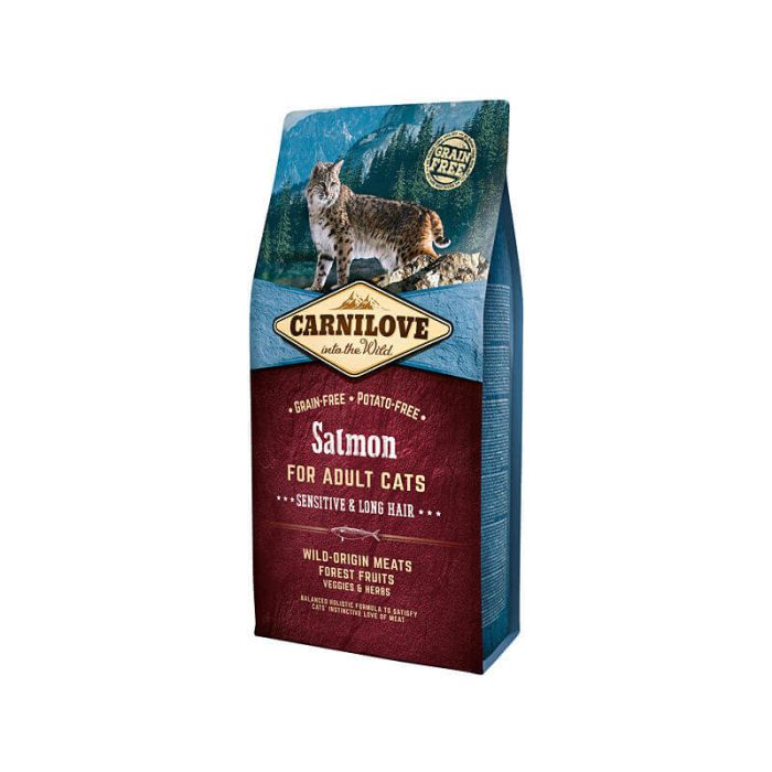Carnilove Cat Salmon Sensitive & Long Hair to pełnowartościowa karma dla dorosłych kotów z wrażliwym układem pokarmowym i długim włosem. Nie zawiera zbóż i ziemniaków.