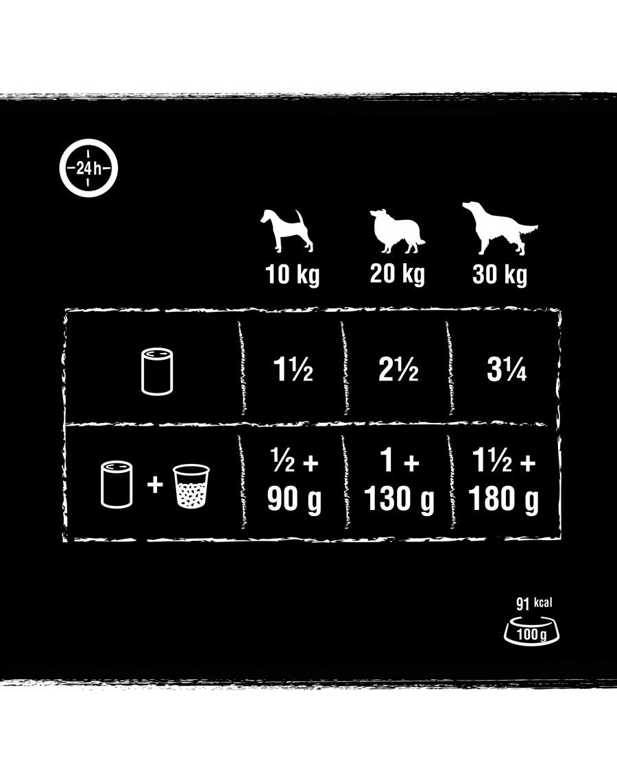 Pamiętaj o uwzględnieniu kalorii pochodzących z przysmaków. Dostosuj ilość karmy do potrzeb zwierzęcia. Podawaj o temperaturze pokojowej. Niewykorzystaną część przechowuj w lodówce do 2 dni. Zapewnij psu stały dostęp do świeżej wody do picia.