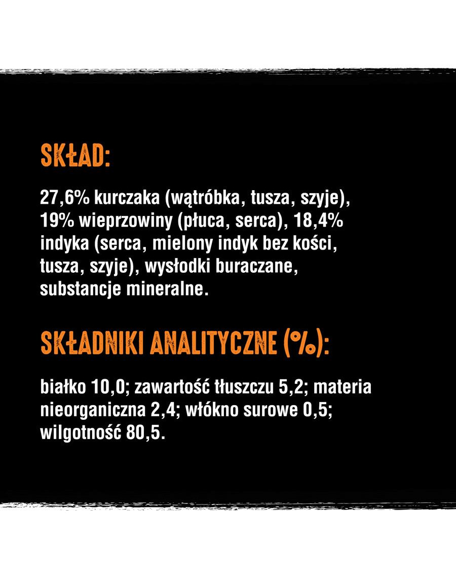 kurczak 24%* (wątróbka, korpusy, szyje), wieprzowina 24% (płuca, serca), indyk 20%* (mielony indyk bez kości, korpusy, szyje), wysłodki buraczane, substancje mineralne.