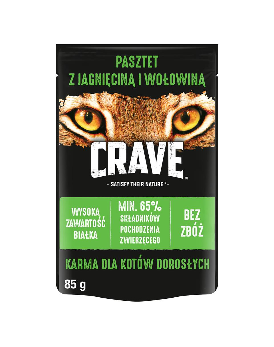 Bezzbożowy CRAVE™ Pasztet z Jagnięciną i Wołowiną jest znakomitą kompletną i zbilansowaną karmą dla kota dorosłego. Wyróżnia się wysoką zawartością białka pochodzenia zwierzęcego, które wspiera rozwój mięśni kota. Karma CRAVE™ to także zaspokojenie pierwotnych potrzeb pupila, wynikających z jego naturalnego instynktu. W jej składzie nie ma sztucznych aromatów ani barwników. Nie znajdziesz w niej także zbóż, kukurydzy, soi ani produktów mlecznych. To jedzenie dla kota, któremu możesz zaufać. Codziennie podawaj pupilowi CRAVE™ Pasztet z Jagnięciną i Wołowiną, aby wspierać instynktowne potrzeby swojego kota.