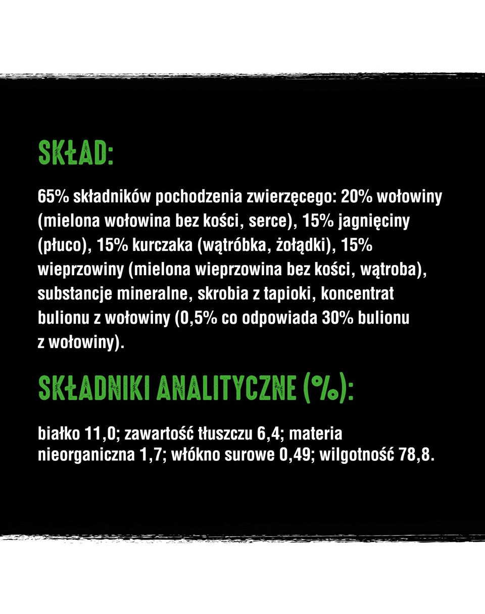 65% składników pochodzenia zwierzęcego: 20% wołowiny (mielona wołowina bez kości, serce), 15% jagnięciny (płuca), 15% kurczaka (wątróbka, żołądki), 15% wieprzowiny (mielona wieprzowina bez kości, wątroba), substancje mineralne, skrobia z tapioki, koncentrat bulionu z wołowiny (0,5% co odpowiada 30% bulionu z wołowiny).