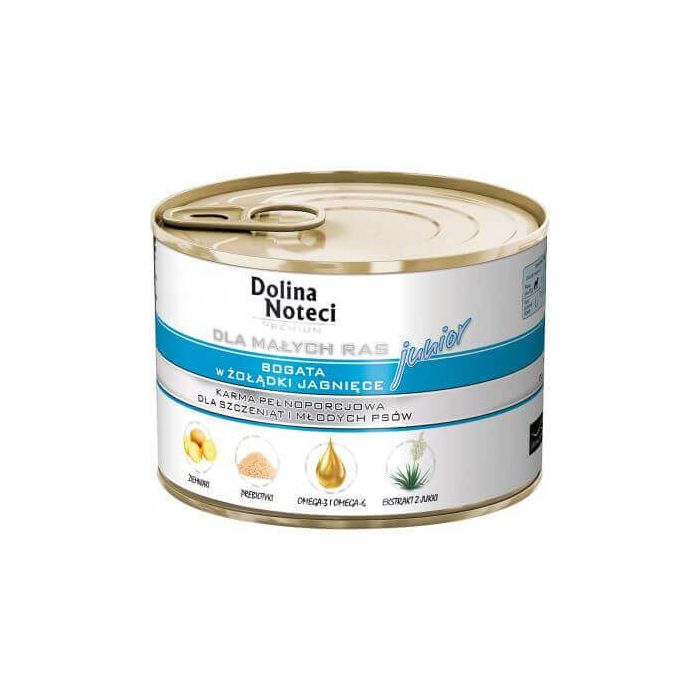 Mokra karma dla szczeniąt i młodych psów ras małych, bogata w żołądki jagnięce.