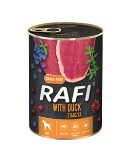 mięso i produkty pochodzenia zwierzęcego 65% (mięso z kaczki 4%), owoce (borówka amerykańska 2%, żurawina 2%), substancje mineralne, oleje i tłuszcze (olej lniany 0,2%), tymianek suszony 0,01%