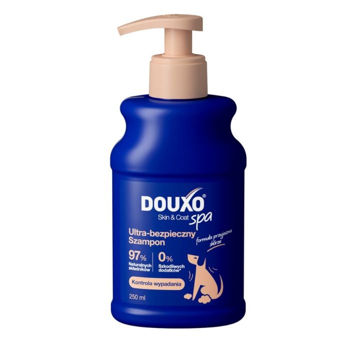 DOUXO Skin & Coat SPA – Ultra-bezpieczny szampon przeciw nadmiernemu linieniu dla psów, 250 ml Redukuje nadmierne linienie, oczyszcza i nawilża skórę, wzmacnia i wygładza sierść, pozostawiając ją miękką i lśniącą. Formuła przyjazna dla skóry.