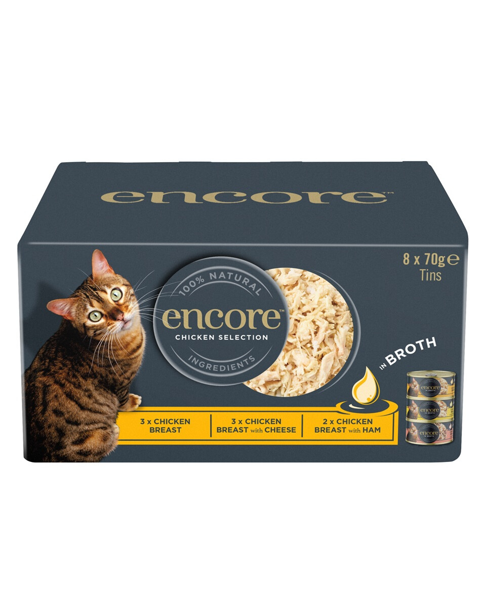 Naturalna, bezzbożowa karma uzupełniająca dla dorosłych kotów. Zestaw 8 saszetek × 70 g oferuje mieszankę różnych smaków opartych na najwyższej jakości piersi z kurczaka, zanurzonych w lekkim bulionie. Receptura marki ENCORE wyróżnia się prostym składem, brakiem zbędnych dodatków oraz dużą zawartością mięsa – idealna dla kotów, które wymagają urozmaicenia w diecie lub mają wrażliwy układ pokarmowy.