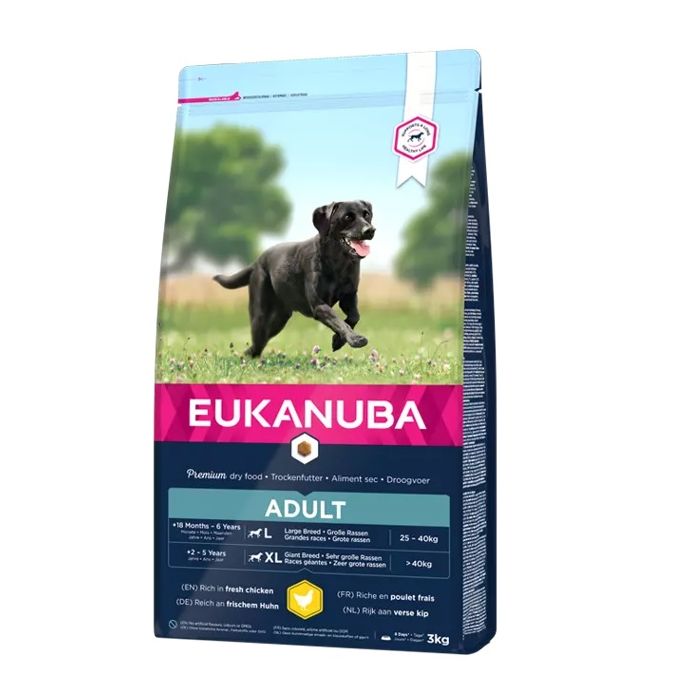 Nowa i udoskonalona receptura EUKANUBA jest dostosowana do etapu życia psa. W 100% pełnoporcjowa karma dla dorosłych psów (Active Adult) dużych ras w wieku od 18. miesięcy do 6. lat zapewnia żywienie wspierające optymalną kondycję ciała (optimal body condition).