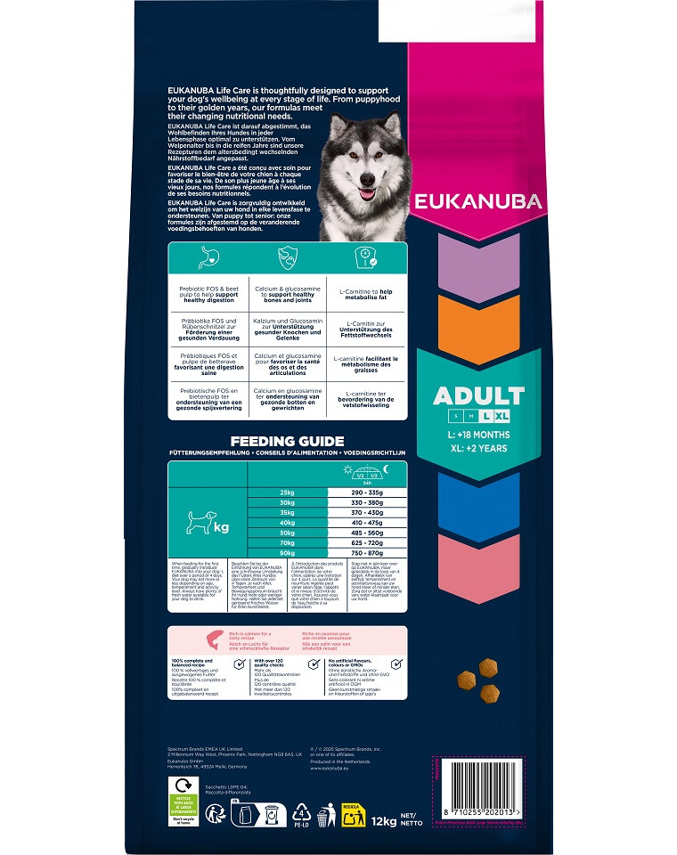 EUKANUBA Life Care to linia karm premium opracowana na podstawie badań naukowych, która wspiera zdrowie psa na każdym etapie życia. Ta karma została stworzona z myślą o dorosłych psach dużych ras (od 18 miesięcy, dla ras olbrzymich od 2 lat), zapewniając im pełnowartościowe i lekkostrawne pożywienie. Granulki bogate w łososia i jęczmień dostarczają łatwo przyswajalnego białka i energii, wspierając aktywność i zdrową kondycję.