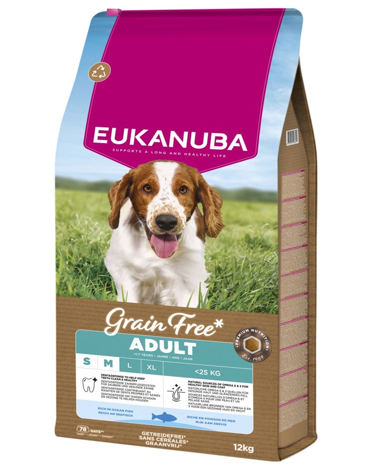 Eukanuba Grain Free to świetny wybór dla psów z wrażliwym układem pokarmowym, nietolerancją zbóż lub wymagających delikatnej, monoproteinowej diety na bazie ryb.