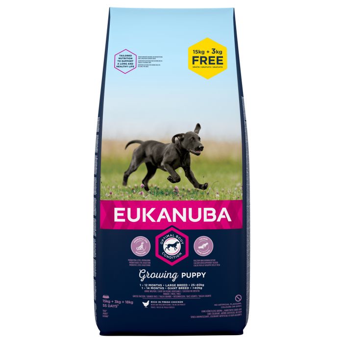 Nowa i udoskonalona receptura EUKANUBA jest dostosowana do etapu życia psa. W 100% pełnoporcjowa karma dla szczeniaków (Growing Puppy) dużych ras w wieku od 3. do 14. miesięcy zapewnia zbilansowane żywienie wspierające wzrost i rozwój Twojego szczeniaka.
