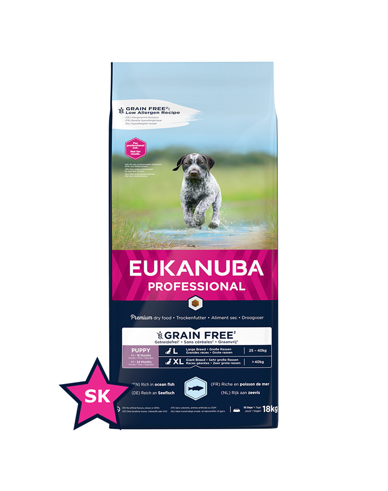 Niskoalergenna karma dla szczeniąt dużych ras ze starannie dobranymi składnikami, które nie wywołują uczuleń. Delikatna, bezglutenowa formuła, * bataty będące naturalnym źródłem błonnika oraz najważniejsze witaminy i antyoksydanty Receptura karmy bez kurczaka zawiera wyłącznie ryby, jako źródło białka zwierzęcego. Karma bogata w ryby oceaniczne i świeżo mrożonego łososia dostarcza Twojemu szczenięciu niezbędną ilość białka zwierzęcego potrzebnego do budowy i utrzymania silnych i nieotłuszczonych mięśni. Prebiotyki FOS i pulpa buraczana wspomagają prawidłowe trawienie. Groszek i bataty jako alternatywne źródło węglowodanów. Dodatek naturalnych źródeł kwasów tłuszczowych Omega-6 i Omega-3 wspiera zdrowie skóry i lśniącą sierść. Odpowiednia zawartość kwasów DHA, które pozytywnie wpływają na zdolność i szybkość uczenia się szczeniąt. EUKANUBA Grain Free* Karma dla szczeniąt dużych ras, stanowi fundament przyszłego zdrowia Twojego psa, bez narażania go na obecność najczęstszych alergenów w pożywieniu.