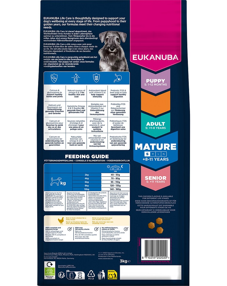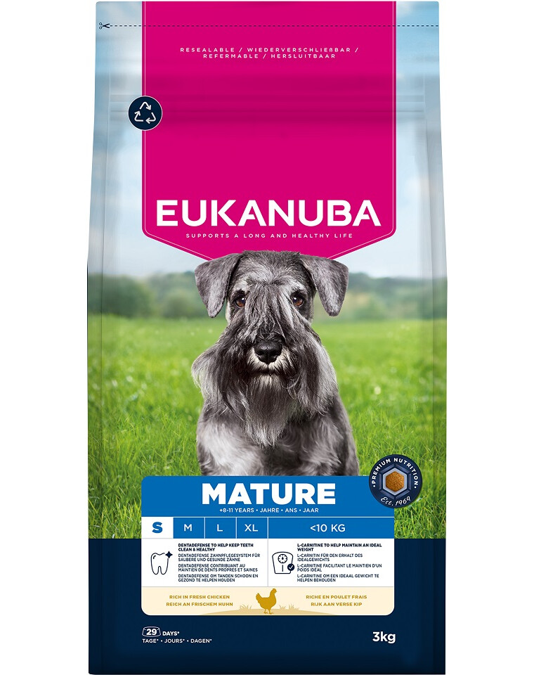 EUKANUBA dla dojrzałych psów, bogata w świeżego kurczaka, jest w 100% kompletna i zrównoważona sucha karma oraz idealna dla małych ras w wieku 8–11 lat, która dostarcza wysokiej jakości białka wspierającego siłę mięśni i prawidłową kondycję organizmu.