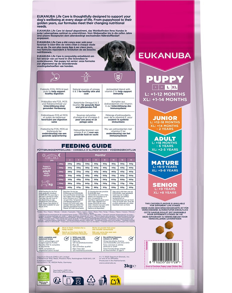 Ta sucha karma EUKANUBA została opracowana z myślą o szczeniętach dużych ras w wieku 1–12 miesięcy oraz ras olbrzymich do 14. miesiąca życia. Jej skład bazuje na świeżym kurczaku, który stanowi wysokiej jakości źródło białka, wspierając prawidłowy rozwój mięśni i ogólną kondycję organizmu.