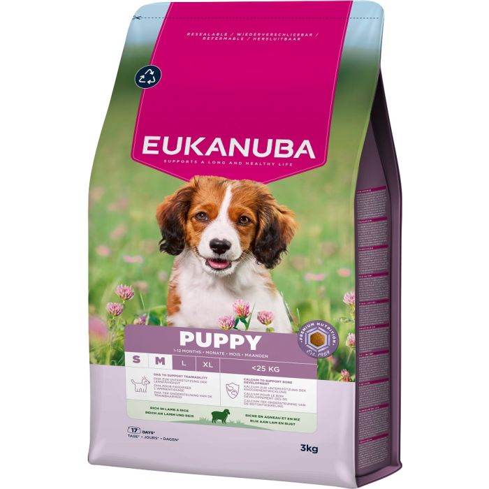 Ta sucha karma EUKANUBA dla szczeniąt, bogata w jagnięcinę i ryż, jest w 100% kompletna i zbilansowana oraz idealna dla psów ras małych i średnich w wieku 1–12 miesięcy.