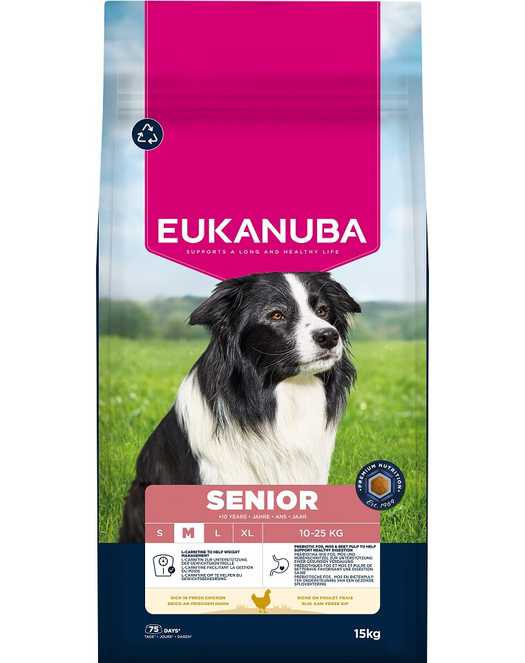 Sucha karma EUKANUBA dla starszych psów, bogata w świeżego kurczaka, jest w 100% kompletna i zrównoważona oraz idealna dla psów średnich ras w wieku powyżej 10 lat.