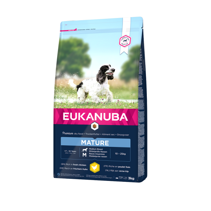 Nowa i udoskonalona receptura EUKANUBA jest dostosowana do etapu życia psa. W 100% pełnoporcjowa karma dla dojrzałych psów (Thriving Mature) średnich ras w wieku od 7. do 10. lat zapewnia żywienie wspierające optymalną kondycję ciała (optimal body condition) i zdrowe starzenie.