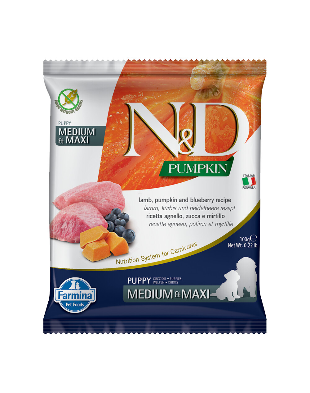 Pełnoporcjowa karma dla szczeniąt i ciężarnych lub karmiących suk, jagnięcina, dynia i jagoda.
