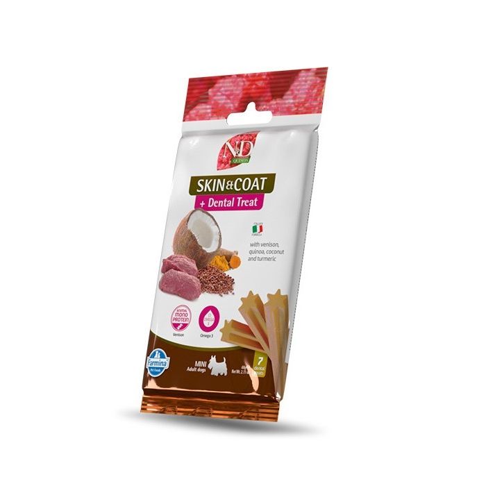 FARMINA N&D Quinoa Skin & Coat z jeleniem to funkcjonalny przysmak dentystyczny opracowany specjalnie dla psów z wrażliwą skórą, alergiami i nietolerancjami pokarmowymi.