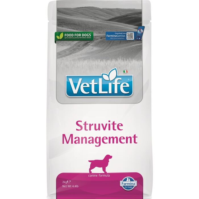 Farmina Vet Life Struvite Management to pełnoporcjowa dietetyczna karma dla psów rekomendowana przy ograniczeniu powstawania kamieni struwitowych.