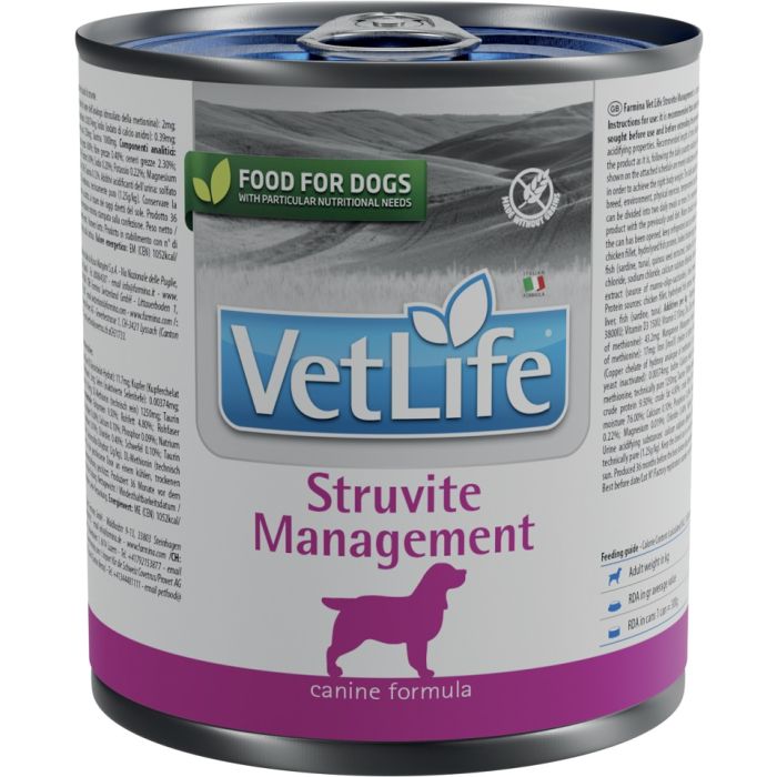 FARMINA Vet Life Natural Diet Dog Struvite Management to dietetyczna pełnoporcjowa karma opracowana w celu zapobiegania ponownemu tworzeniu się kamieni struwitowych.