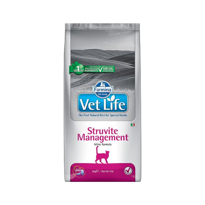 Farmina Vet Life Struvite Management to pełnoporcjowa karma dietetyczna dla kotów dla ograniczenia powstawania kamieni struwitowych i kamicy dróg moczowych.