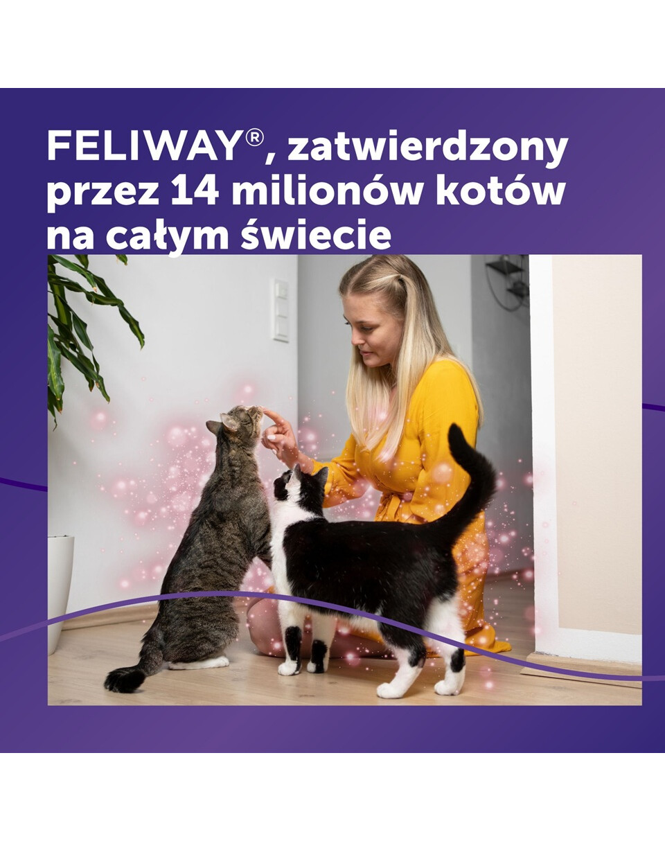 FELIWAY Friends pomaga kotom żyć w harmonii, unikać napięć i konfliktów, dzięki uwalnianiu „sygnałów harmonii”.