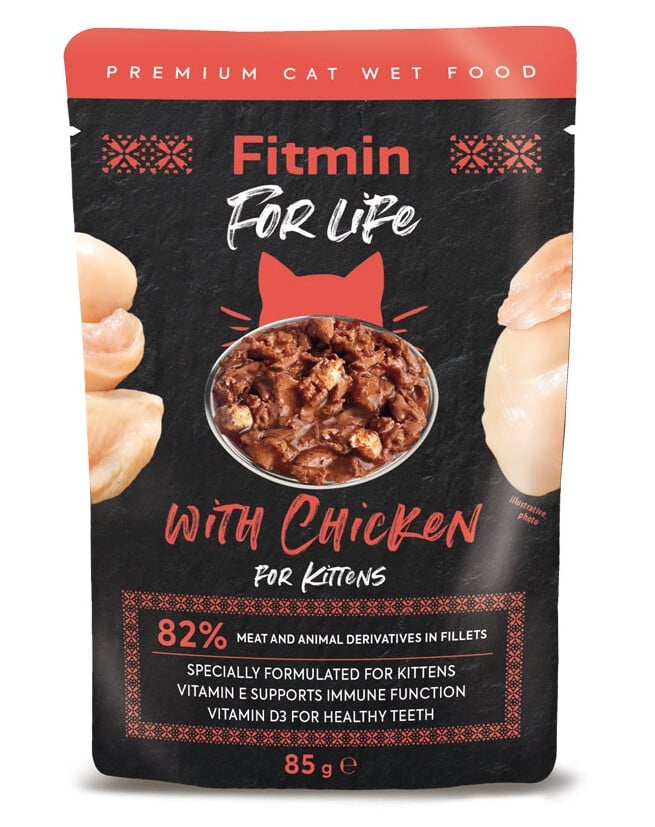Zawartość w formie filecików z mięsem, zanużonych w mocno aromatycznym sosie. Skład oparty na 82% produktach pochodzenia zwierzęcego, z kurczakiem. Dodatek inuliny wspiera prawidłowy metabolizm i poprawia odporność organizmu. Cynk dba o skórę i sierść.