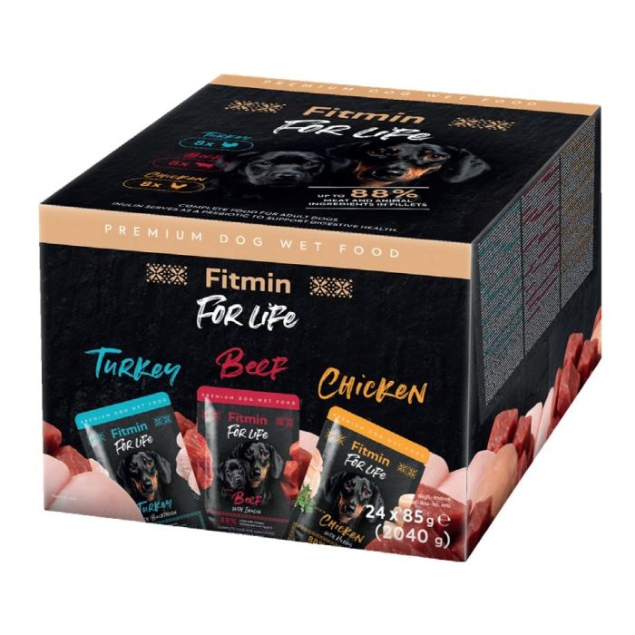 FITMIN For Life Dog Multipack 24x85 g saszetki dla psów z kurczakiem, z wołowiną i indykiem
