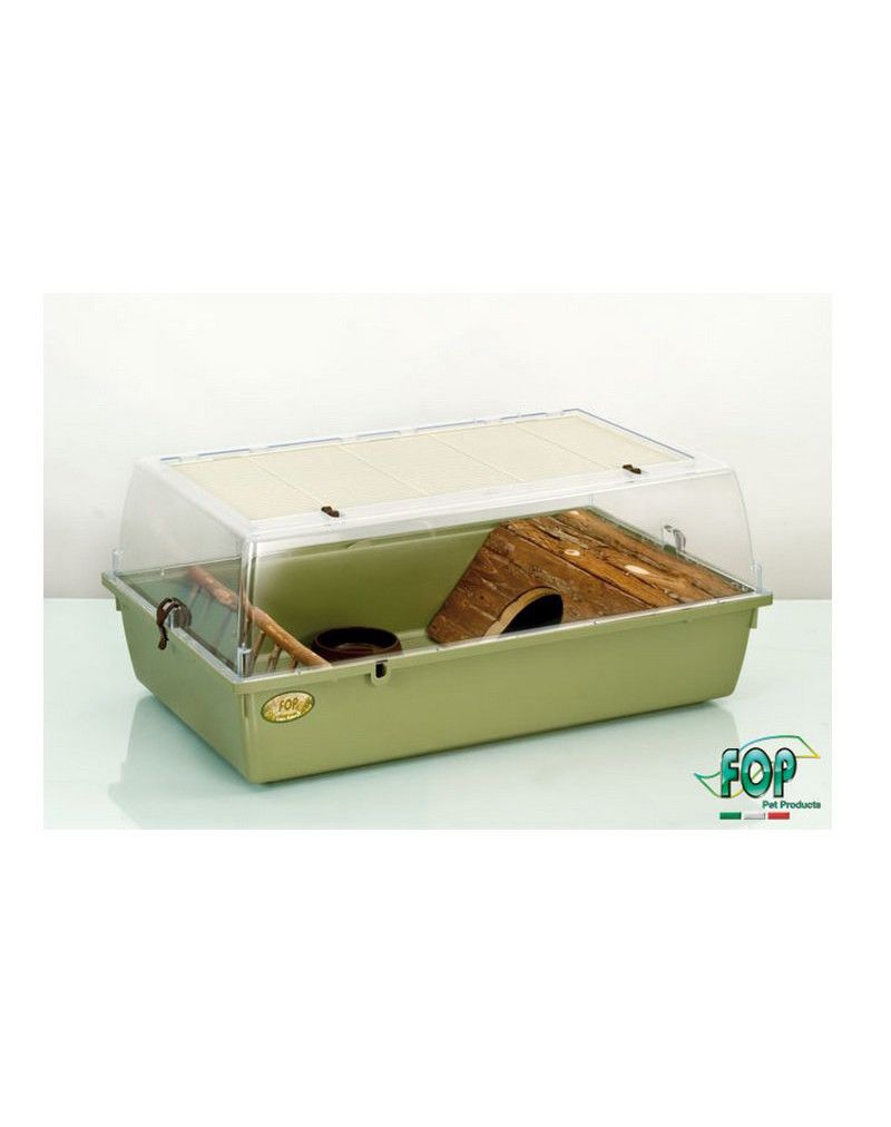 Klatka wykonana z plastiku wysokiej jakości, wyposażona w półkę na siano oraz schronienie wykonane z drewna. Wymiary 33 x 47 x 75 cm.