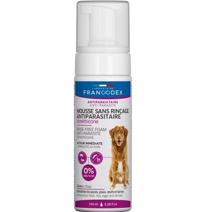 FRANCODEX Pianka bez spłukiwania na pchły i kleszcze dla psów zawiera dimetikon i stanowi bezpośredni sposób na zwalczanie pasożytów zewnętrznych, takich jak pchły, kleszcze. Działanie piany jest czysto mechaniczne: zawarty w produkcie polidimetylosiloksan działa jak pułapka, przyciągając pasożyta i unieruchamiając go. Nie mogą się poruszać, samoistnie odpadają lub są usuwane podczas szczotkowania. Ponieważ nie zawiera pestycydów i ma jedynie działanie mechaniczne, piankę można stosować nawet u kobiet w ciąży lub karmiących piersią.