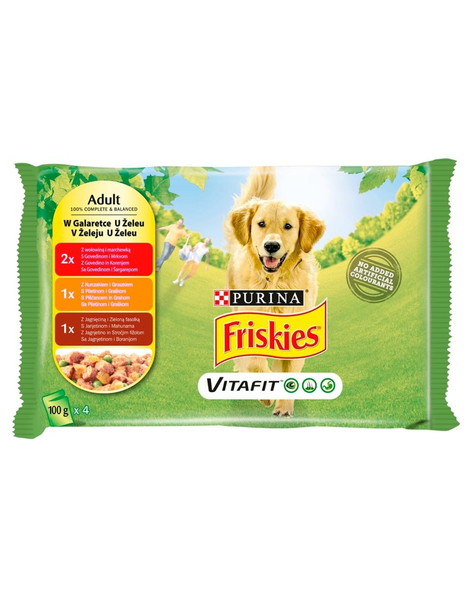 Purina Friskies Adult Vital w galaretce zamknięte w praktycznych saszetkach wspierają zdrowie Twojego psa. Zapewnia witalność zwierząt: zwarte stolce, dzięki zdrowemu trawieniu, lśniącą sierść i zdrową skórę, błysk w oku - oznakę czujności. Dostarcza wszystkich witamin i składników odżywczych niezbędnych do utrzymania odpowiedniej kondycji. Bez dodatku sztucznych barwnikw, aromatów i konserwantów.