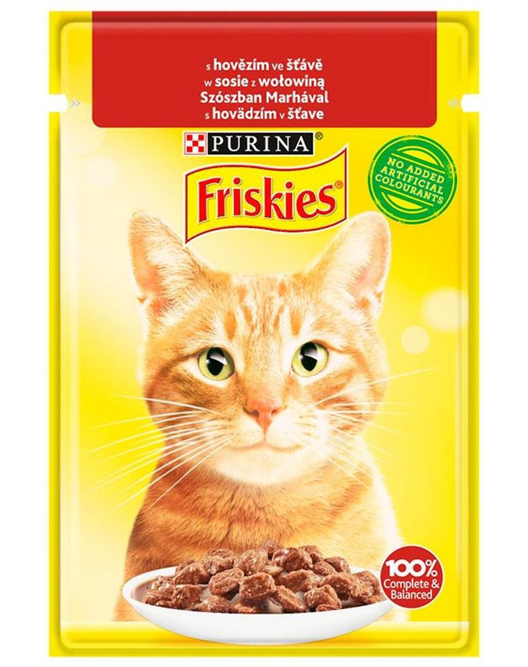 Karma mokra Friskies z wołowiną to w pełni zbilansowana karma, która dostarcza kotom składniki odżywcze, których potrzebuje do prawidłowego funkcjonowania oraz smaki, które pokocha. Wspiera zdrowie, witalność i dobre samopoczucie kota. Dzięki wysokiej zawartości wody sprzyja produkcji bardziej rozcieńczonego moczu zapobiegając tym samym kamicy nerkowej.