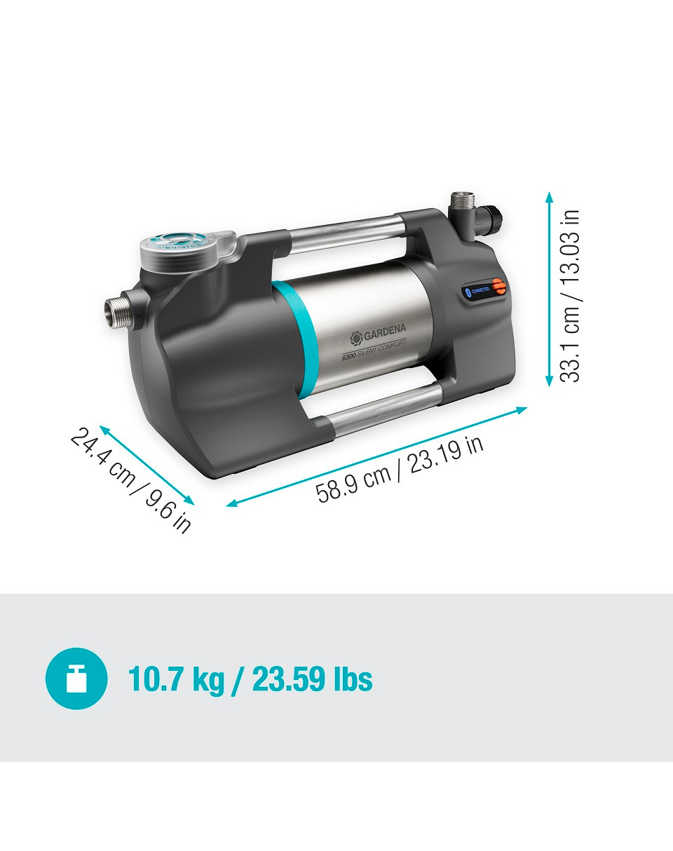 Pompa ogrodowa 6300 SilentComfort to urządzenie zapewniające najwyższą wydajność. Pompa imponuje efektywnością energetyczną i wyjątkowo niskim poziomem hałasu. Dzięki wysoce wydajnemu układowi hydraulicznemu o zużyciu energii zaledwie 1050 W osiąga niesamowity przepływ wody do 6300 l/h i wysokość podnoszenia 49 m (4,9 bar). Można go wykorzystać do zbierania wody z beczek deszczowych, studni lub cystern do głębokości 8 metrów. Dzięki innowacyjnej wielostopniowej pracy i chłodzeniu wodą opracowana w Niemczech pompa SilentComfort jest wyjątkowo cicha podczas pracy, a poziom hałasu wynosi zaledwie 45 dB (A) w odległości 5 m. Technologia ta nie wymaga wentylatora, ponieważ ciepło jest rozpraszane w wodzie. Zapewnia to maksymalną wydajność i minimalny poziom hałasu. Z wyjątkiem tworzenia harmonogramu nawadniania, wszystkie funkcje można ustawić za pomocą podświetlanego ekranu LCD urządzenia, który umożliwia także jego włączanie i wyłączanie. Blokada ta zapobiega przypadkowemu uruchomieniu pompy przez dzieci. Dzięki połączeniu Bluetooth ze smartfonem lub tabletem możesz zdalnie sterować wszystkimi funkcjami oraz korzystać z dodatkowych funkcji z odległości 10 m. Oprócz tego możesz ustawić harmonogramy i timery nawadniania, a także otrzymywać przypomnienia o nadchodzących terminach czyszczenia filtra. Przy pierwszym uruchomieniu pompy szczegółowe instrukcje w aplikacji pomogą Ci przygotować pompę do pracy. Możliwość połączenia z czujnikiem wilgotności gleby GARDENA (nr art. 1867-20) gwarantuje optymalne podlewanie roślin bez marnowania wody. Pompa GARDENA 6300 SilentComfort jest odporna na wszelkie warunki atmosferyczne i dlatego można ją pozostawić na zewnątrz przez cały sezon. Nie będą miały na niego negatywnego wpływu utrzymujące się opady deszczu lub wysoka wilgotność (np. mgła). Dzięki temu możesz umieścić go bliżej źródła wody. Wytrzymałe gumowe nóżki zapewniają jego stabilność. Zabezpieczenie przed suchobiegiem w połączeniu z zabezpieczeniem przed przegrzaniem i zintegrowanym filtrem wstępnym zapobiega przedostawaniu się cząstek brudu do pompy lub urządzenia wyjściowego, gwarantując długą żywotność. Pompa ciśnieniowa jest bardzo trwała dzięki zastosowaniu wysokiej jakości materiałów, takich jak obudowa ze stali nierdzewnej i aluminiowy uchwyt. Zbiorniki, takie jak studnie i beczki na deszczówkę, mogą oszczędzać cenną słodką wodę. Jest to dobre dla Twojego portfela i środowiska, szczególnie podczas suchych letnich miesięcy. Pompa ogrodowa wyposażona jest w uszczelkę ceramiczną z podwójnym systemem uszczelnień oraz wał ze stali nierdzewnej pomiędzy układem hydraulicznym a silnikiem. Wlot ssący i dwa wyloty (z których jeden można obrócić o 180°) również wykonano ze stali nierdzewnej. Można używać wielu urządzeń jednocześnie. Szeroki otwór wlewowy i zawór spustowy sprawiają, że napełnianie pompy jest niezwykle łatwe i zapewniają ochronę przed zamarzaniem.