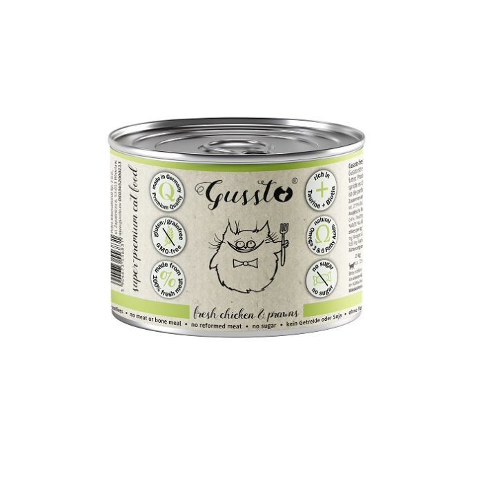 Gussto Fresh Chicken & Prawns – Świeży kurczak z krewetkami – pełnowartościowa, kompletna i znakomicie zbilansowana karma super - premium dla kotów. Produkowana jest w 100% z najwyższej jakości świeżego mięsa w wysokim standardzie odpowiadającym wymaganiom żywności dla ludzi. Gussto to esencja dobrego i zdrowego żywienia. Zawiera bardzo dużo mięsa idealnie odpowiadając specyficznym wymaganiom pokarmowym kotów. Jest to karma lekkostrawna i bardzo dobrze przyswajalna. Znakomicie zrównoważony stosunek wapń/fosfor minimalizuje ryzyko chorób układu moczowego i nerek. Karma Gussto zawiera dużo niezbędnych witamin i minerałów jest bardzo bogata w Taurynę i Biotynę, a w jej skład wchodzi dobroczynny olej z łososia – bogaty w nienasycone kwasy tłuszczowe, które mają działanie przeciwzapalne.