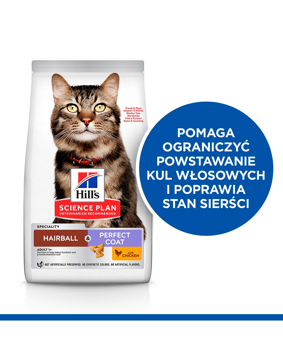 HILL'S Science Plan Hairball & Perfect Coat karma dla dorosłych kotów z kurczakiem pomaga zapobiegać powstawaniu trichobezoarów oraz wspiera lśniącą sierść i zdrową skórę.